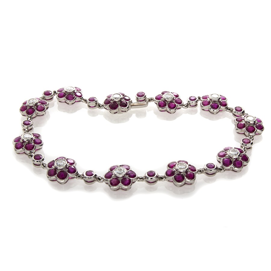 A DELICATE EIGHTEEN CARAT WHITE GOLD FLOWER LINK DESIGN BRACELET CONTAINS 77 ROUND RUBIES WEIGHING 9.83 CARATS AND 11 FULL CUT DIAMONDS WEIGHING .97 CARAT.