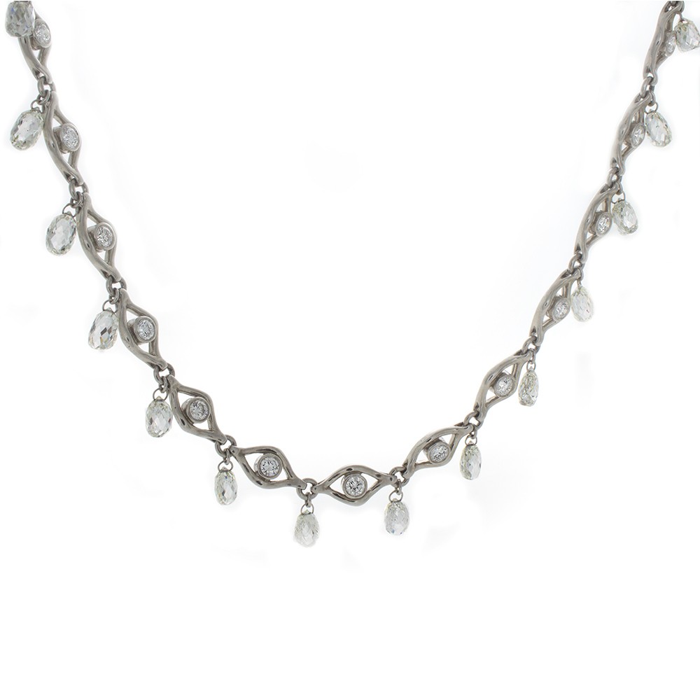A PLATINUM NECKLACE MADE OF SINGLE FULL CUT DIAMOND LINKS DISPURSED WITH A BRIOLETTE DROP CONTAINS 27 BRIOLETTE DIAMONDS AND 28 FULL CUT DIAMONDS FOR A TOTAL WEIGHT OF 22.10 CARATS. MEASURES 16".