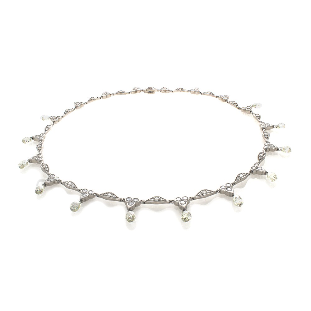 PLATINUM LINKS ARE STUDDED WITH 108 FULL CUT DIAMONDS WEIGHING 5.61 CARATS. TWELVE ALTERNATING LINKS HAVE BRIOLETTE DIAMOND DROPS FOR A TOTAL WEIGHT OF 11.24 CARATS.