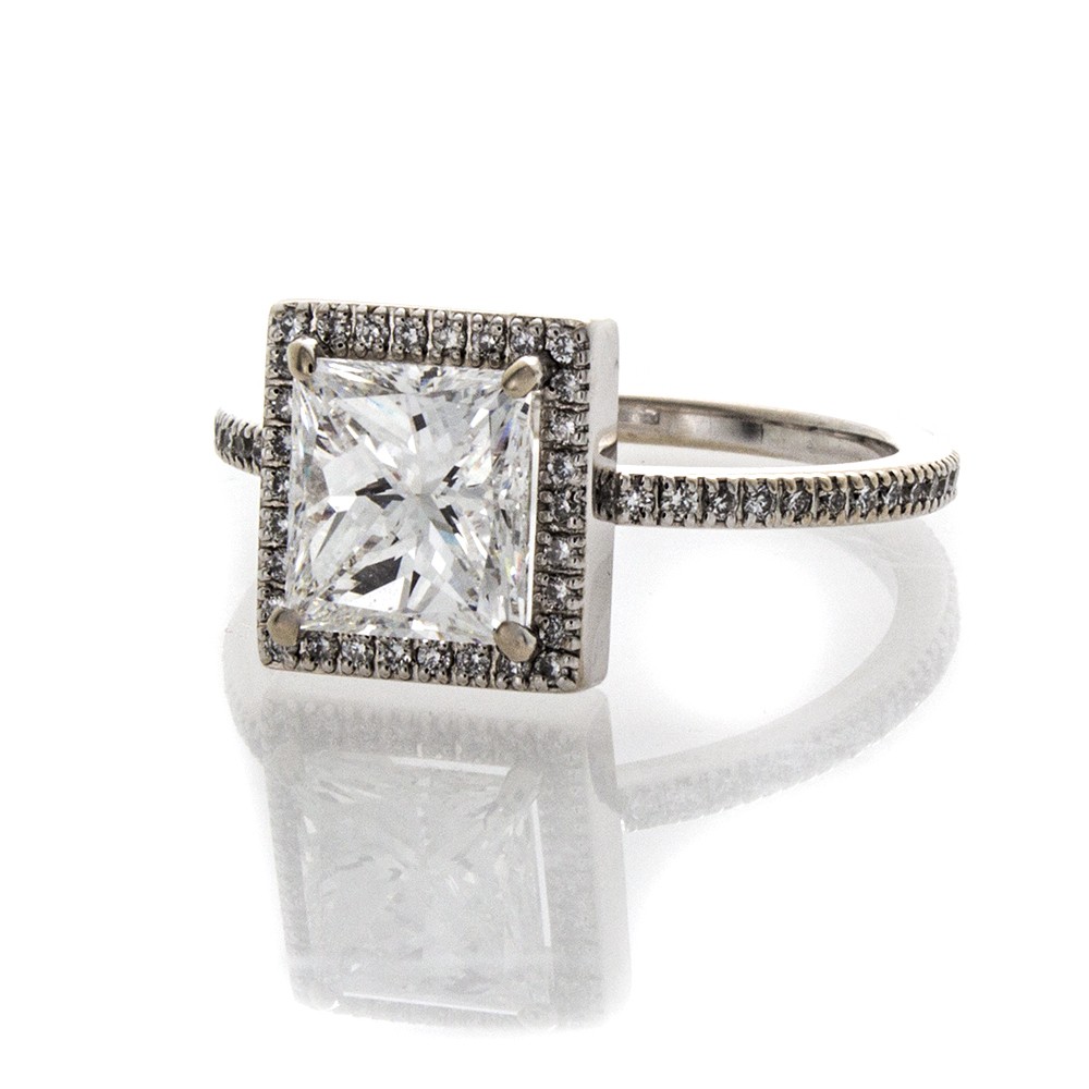 AN EIGHTEEN CARAT WHITE GOLD MOUNTING CONTAINS A PRINCESS CUT DIAMOND WEIGHING 1.62 CARATS AND 81 FULL CUT DIAMONDS WEIGHING .40 CARAT.