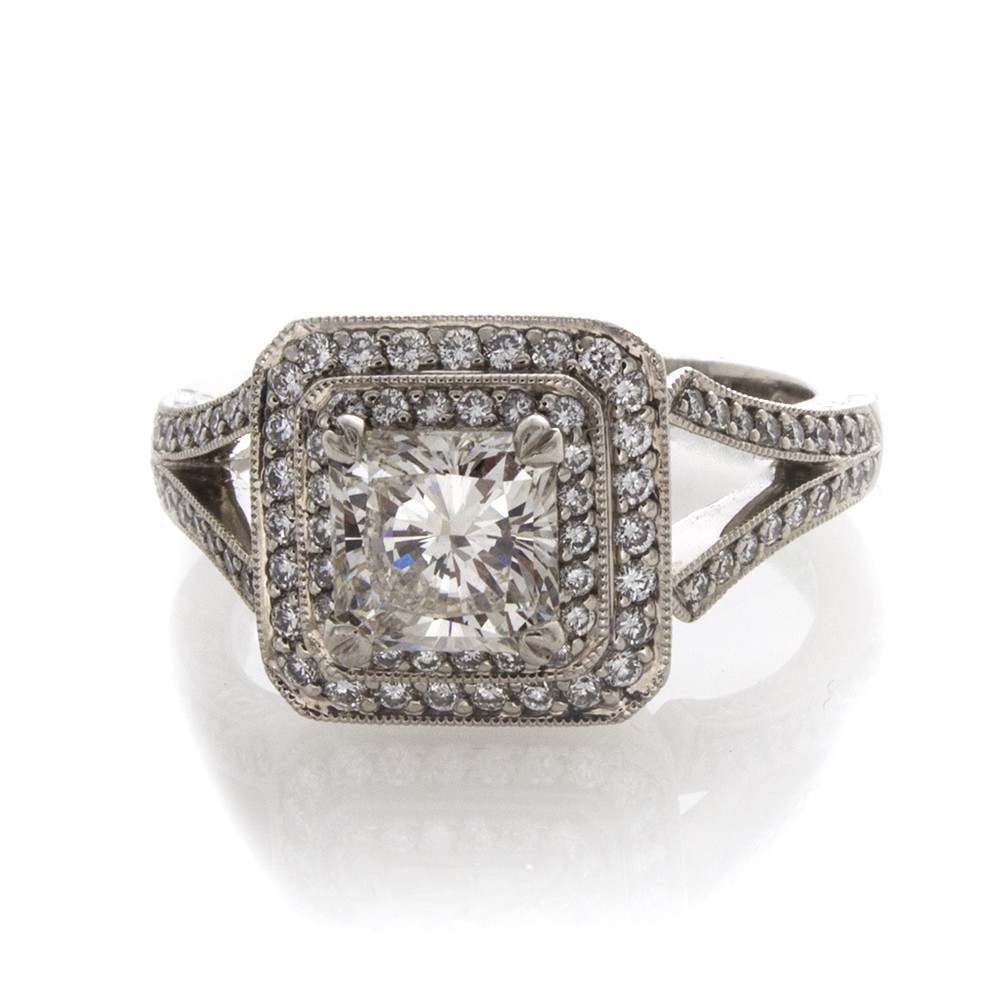 A PLATINUM DESIGNER MOUNTING CONTAINS A CENTER RADIANT CUT DIAMOND WEIGHING 1.00 CARAT AND 85 FULL CUT DIAMONDS WEIGHING .41 CARAT.
