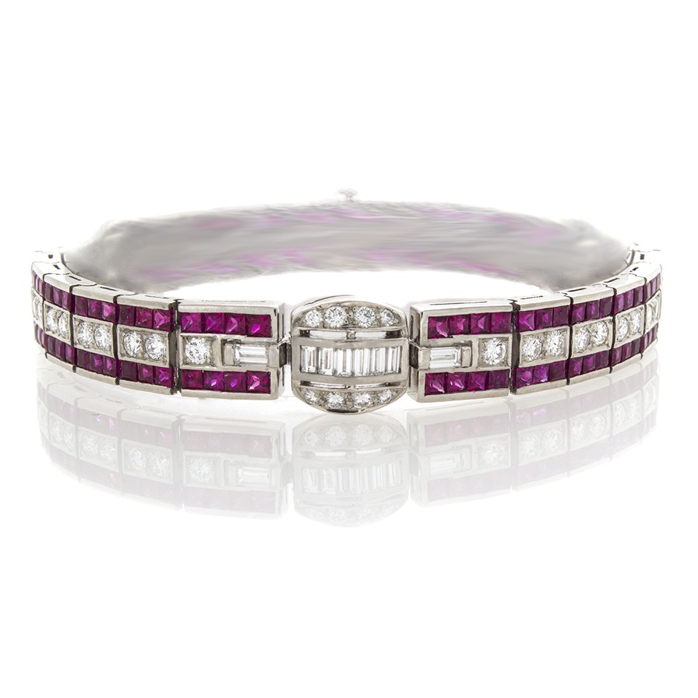 A PLATINUM BRACELET CONTAINS 144 RUBIES WEIGHING 8.50 CARATS, 24 BAGUETTE DIAMONDS WEIGHING 1.17 CARATS AND 62 FULL CUT DIAMONDS WEIGHTING 2.20 CARATS.