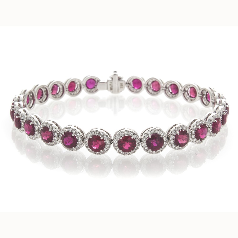 AN EIGHTEEN CARAT WHITE GOLD BRACELET CONTAINS 26 ROUND RUBIES WEIGHING 11.39 CARATS THAT ARE EDGED WITH 364 FULL CUT DIAMONDS WEIGHING 2.08 CARATS.