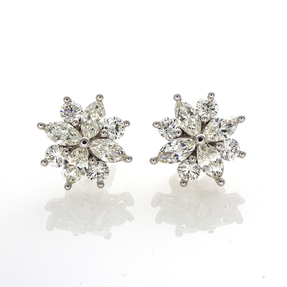 MARQUISE AND BRILLIANT CUT DIAMONDS OF APPROXIMATELY 5 CARATS ARE ARRANGED IN A SYMETRIC DESIGN RESEMBLING SNOWFLAKES IN THESE EIGHTEEN CARAT WHITE GOLD EARRINGS.